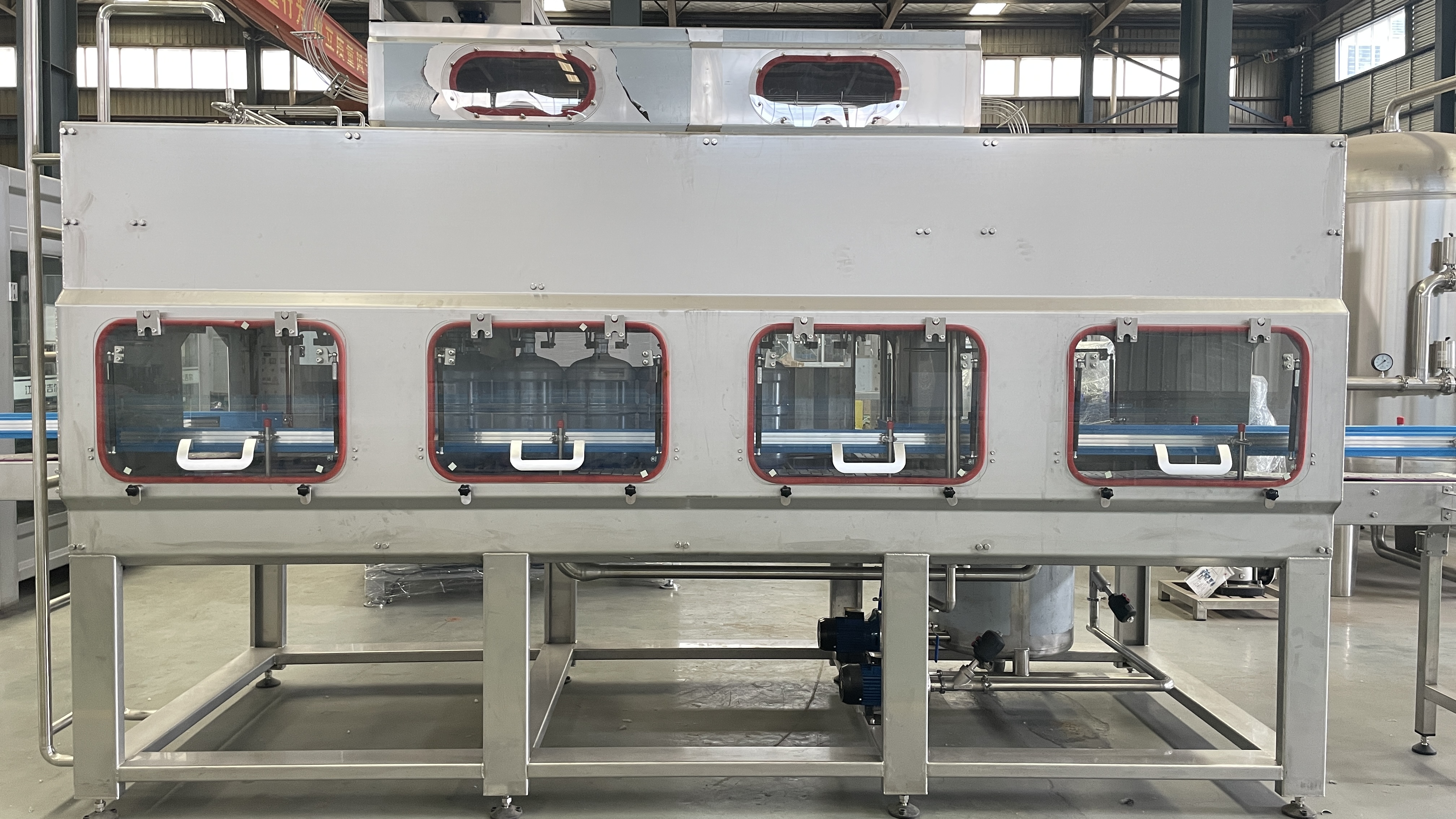 本設備集自動拔蓋、洗桶、自動上瓶、內(nèi)沖洗系統(tǒng)、灌裝、上蓋、套蓋、壓蓋、熱收縮膜、自動套標機、自動套袋機、碼垛機及成品輸送于一體,整個生產(chǎn)過程都有采用封閉式運行,加上紫外線殺菌、臭氧消毒,保證了整個洗瓶灌裝過程完全達到國家衛(wèi)生部門的有關(guān)標準和規(guī)定,有效防止了飲用水在灌裝過程中可能發(fā)生的二次污染,做到無菌生產(chǎn)。