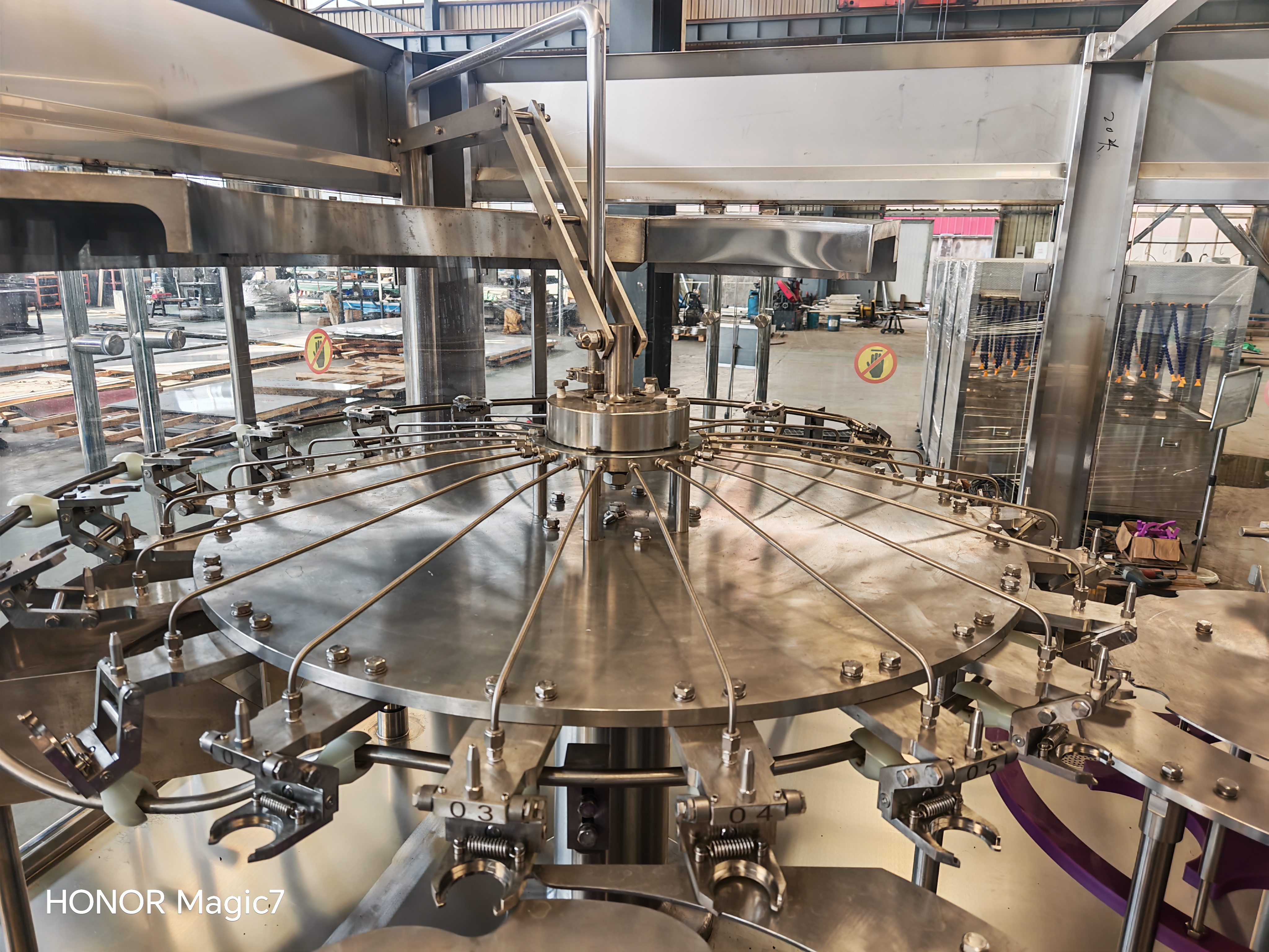 該機(jī)的生產(chǎn)過程如下:瓶子通過分瓶撥輪傳送至三合一灌裝機(jī)的沖瓶機(jī)上。沖瓶機(jī)的回轉(zhuǎn)盤上裝有卡瓶口式不銹鋼瓶夾,瓶夾夾住瓶頸翻轉(zhuǎn)180°使瓶口向下。在沖瓶機(jī)的定區(qū)域,特制噴嘴噴出沖瓶水,對瓶子內(nèi)壁進(jìn)行沖洗。瓶子經(jīng)沖洗、瀝干后在瓶夾夾持下再翻轉(zhuǎn)180°使瓶口向上。洗凈后的瓶子通過輸送帶沖導(dǎo)出并傳送至灌裝機(jī)。進(jìn)入灌裝機(jī)的瓶子由提升氣缸上的瓶夾卡住瓶口保持,并在凸輪作用下實(shí)現(xiàn)上升與下降。灌裝機(jī)采用重力灌裝方式,瓶口上升頂開灌裝閥開始灌裝。灌裝結(jié)束后瓶口下降離開灌裝閥,瓶子通過輸送入旋蓋機(jī)。旋蓋機(jī)上的止旋刀卡住瓶頸部位,保持瓶子直立并防止旋轉(zhuǎn)。旋蓋頭在旋蓋機(jī)上保持公轉(zhuǎn)并自轉(zhuǎn),在凸輪作用下實(shí)現(xiàn)抓蓋、套蓋、旋蓋、脫蓋動(dòng)作,完成整個(gè)封蓋過程。成品瓶通過出瓶撥輪從旋蓋機(jī)傳送到出瓶輸送鏈上,由輸送鏈傳送出三合一灌裝機(jī)。整機(jī)采用落地式封窗,美觀、大方。